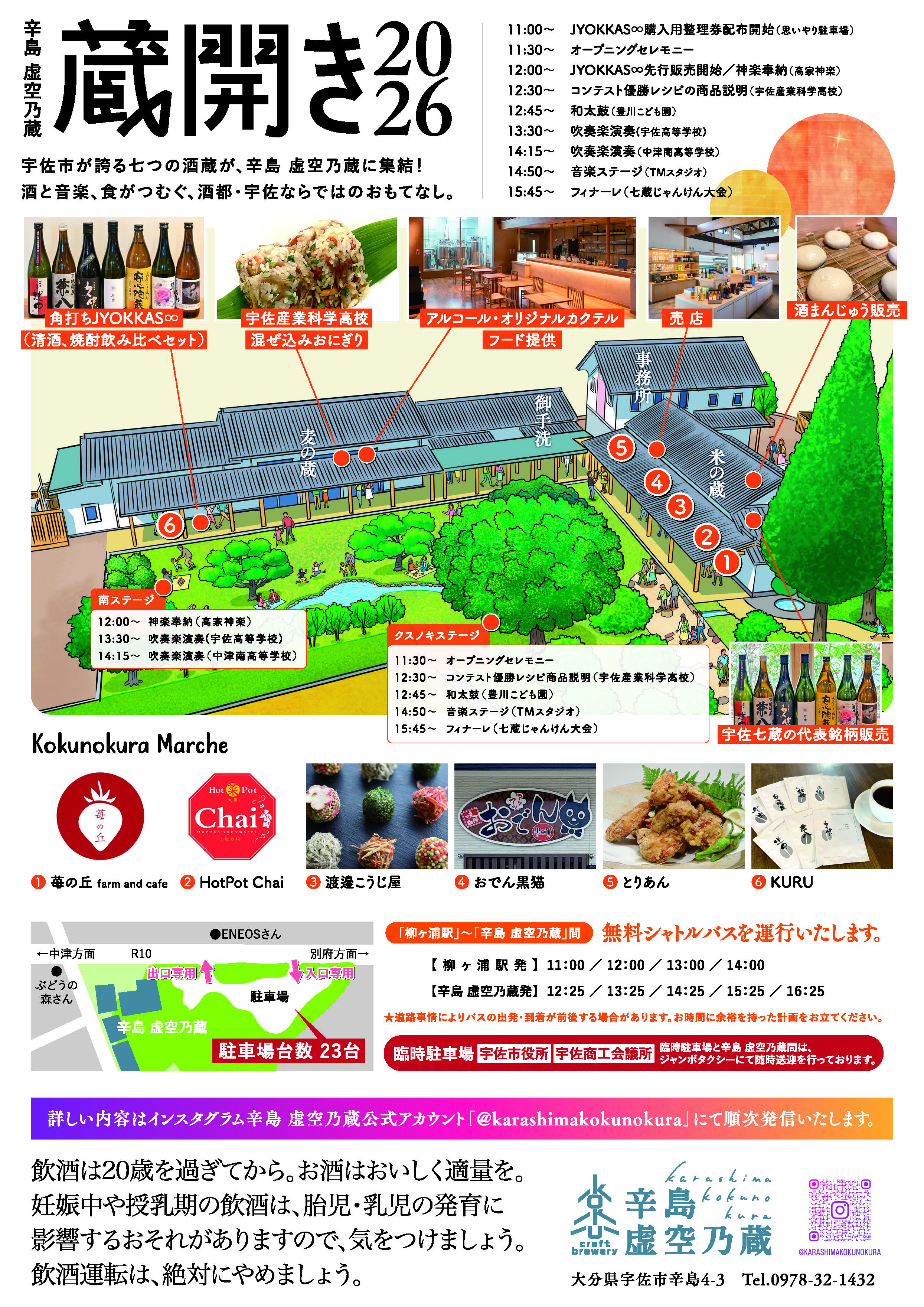 | イベント内容 | ■宇佐七蔵による共同醸造酒「JYOKKAS∞720ml(15%)」限定200本先行販売 ※11:00より辛島 虚空乃蔵駐車場内にて整理券を配布いたします ■宇佐七蔵代表銘柄販売 ■角打ちJYOKKAS∞(日本酒 ・焼酎飲み比べ / おつまみ付き) ■宇佐産業科学高等学校考案「郷土料理甲子園inおおいた」 優勝レシピ限定販売 ■辛島 虚空乃蔵マルシェ ■神楽奉納(高家神楽) / 和太鼓(豊川こども園) / 吹奏楽部演奏(宇佐高等学校・中津南高等学校) / 音楽ステージ (TMスタジオ) ■七蔵じゃんけん大会 |